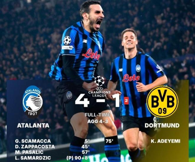 北京时间2月26日,在欧冠淘汰赛附加赛次回合的比赛中,亚特兰大在首回合0-2告负的情况下,最终依靠斯卡马卡、扎帕科斯塔以及帕萨利奇的进球,外加萨马尔季奇读秒的点球绝杀4-1大胜多特蒙德,两回合总比分4-3逆转晋级。